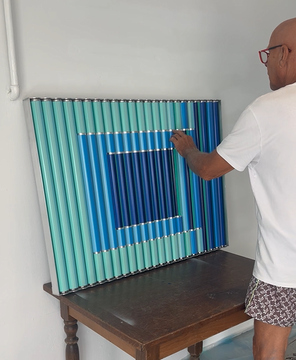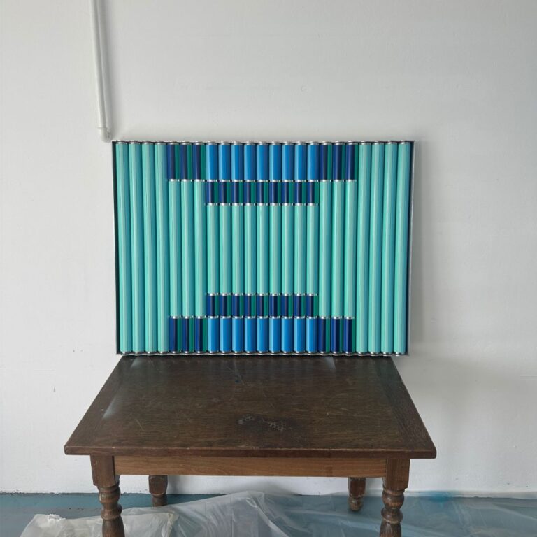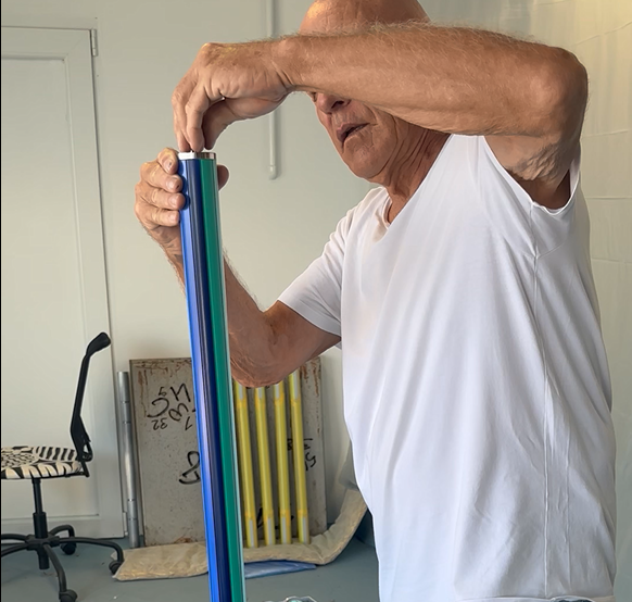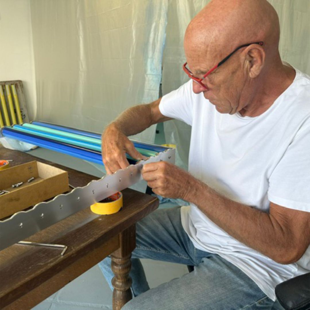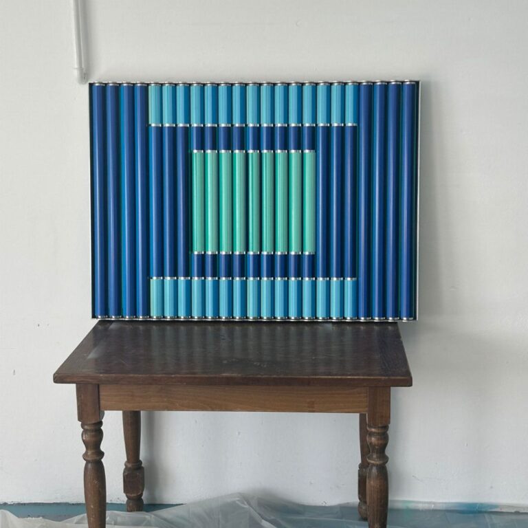 L’élément clé de « DANSE DES COULEURS » réside dans ses tubes aluminium rotatifs, chacun des 23 tubes est munis de 9 couleurs et est fixer à ses extrémités par un roulement à bille, qui lui permet de tourner sur lui-même. Lorsque l’on lance la rotation, une magie opère : les couleurs se mélangent, les formes se redéfinissent et les motifs se métamorphosent. Ce mouvement dynamique transforme l’œuvre, créant une expérience visuelle unique à chaque rotation.